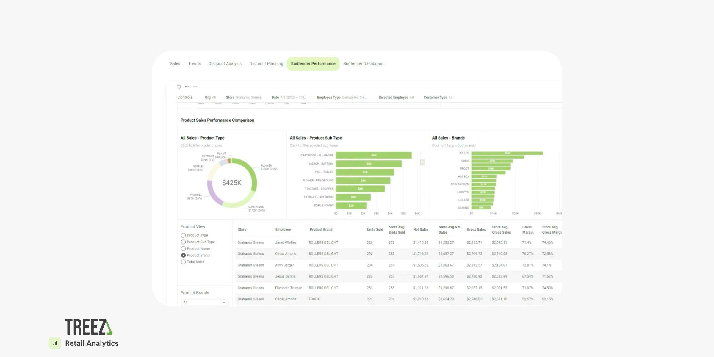 Do your budtenders have favorites? With Retail Analytics, now you can clearly see the data on budtender brand preferences in a few clicks. Depending on your store setup, brand deals, or vertical integration, it may be time to incentivize budtenders to recommend in-house or other brands more than they do now. Use Budtender Performance under Sales inside Treez Retail Analytics to get up-to-date data on budtender preferences.