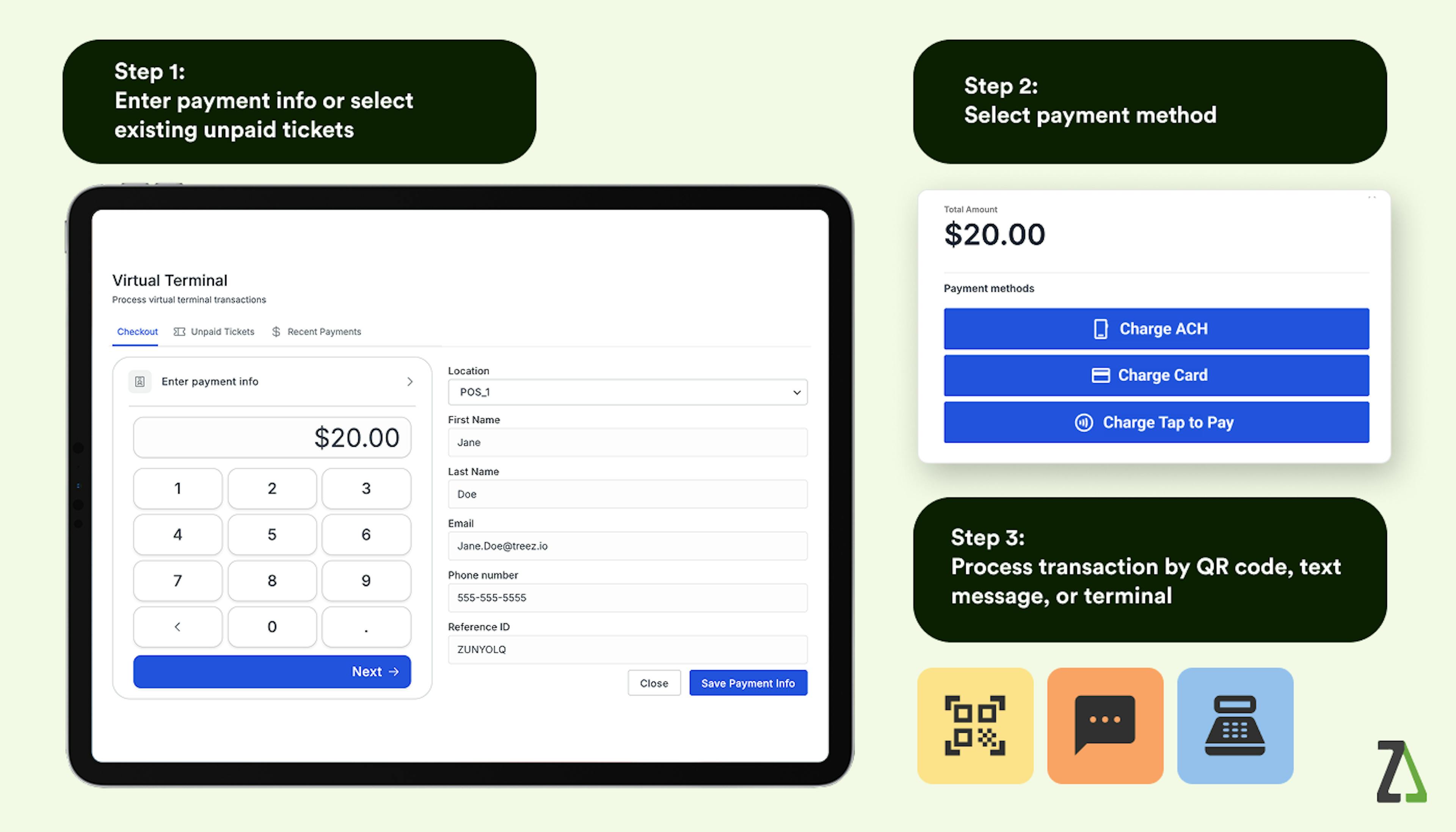 Choose how your customer wants to pay: card, tap-to-pay, or ACH. You can also select your preferred payment provider directly from the TreezPay network to ensure the best processing route.
